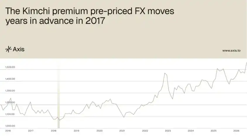 历史数据让这一点具象化。回顾 2017 年,当美元兑韩元(USD/KRW)汇率约为 1060 时,“泡菜溢价”一度飙升至 40% 的峰值,这意味着其实际上的 USDT/KRW 隐含汇率已高达 1480 左右。到了 2024 年 12 月,现实中的美元兑韩元汇率确实突破了 1480。换言之,该溢价提前数年对这一外汇走势进行了预先定价。这些信号早已深藏于公开可见的数据之中,但唯有依托韩国本土的资讯渠道,方能对其做出准确的解读。