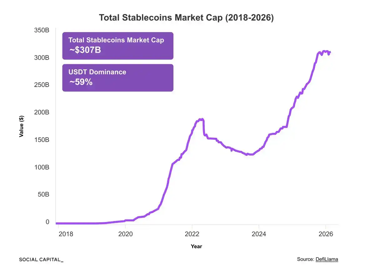 这一扩张与稳定币的兴起同步发生。这些与法定货币挂钩的代币在不到五年的时间里增长了超过十倍,现在已成为链上金融活动的主要结算层:
