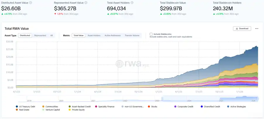 RWA.xyz 最新数据披露,截至2026年3月27日,RWA 链上总市值保持稳健增占比至266亿美元,环比上月同期上涨4.73%,成为规模扩张的主要支撑。资产持有者总数增至约69.4万,环比上月同期增加6.07%,增速超过资产规模增速。