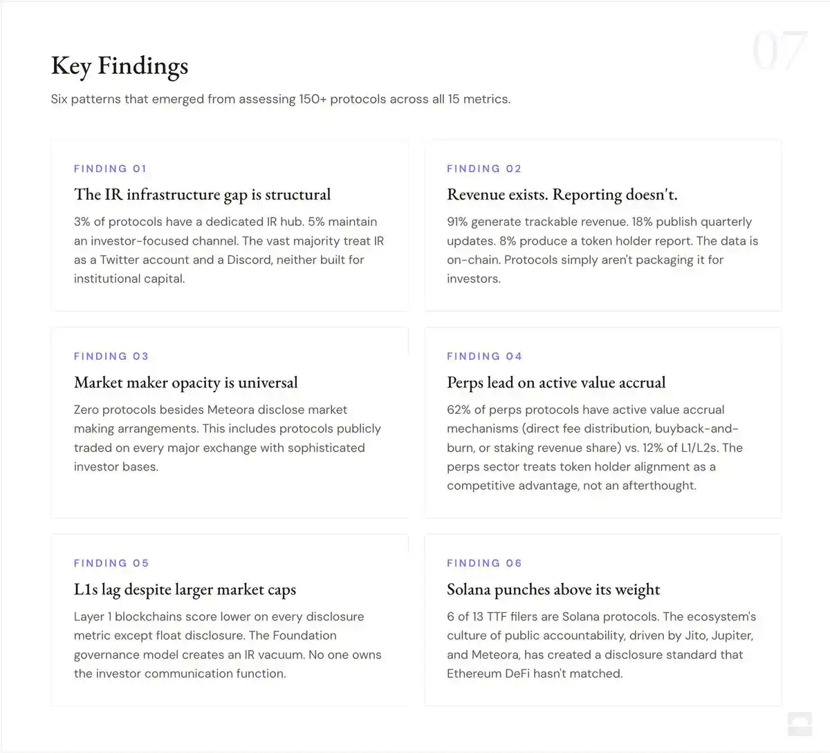 但只有 3% 的公司建立了专门的投资者关系中心,将这些数据整合到面向投资者的体验中。例外协议包括 Meteora、Jito、Jupiter、Raydium、MetaDAO。其他所有协议都把信息分散在博客、治理论坛、X 线程和第三方平台上。没有一个集中化、机构级别的投资者体验。差距不在于数据是否可用,而在于沟通基础设施。