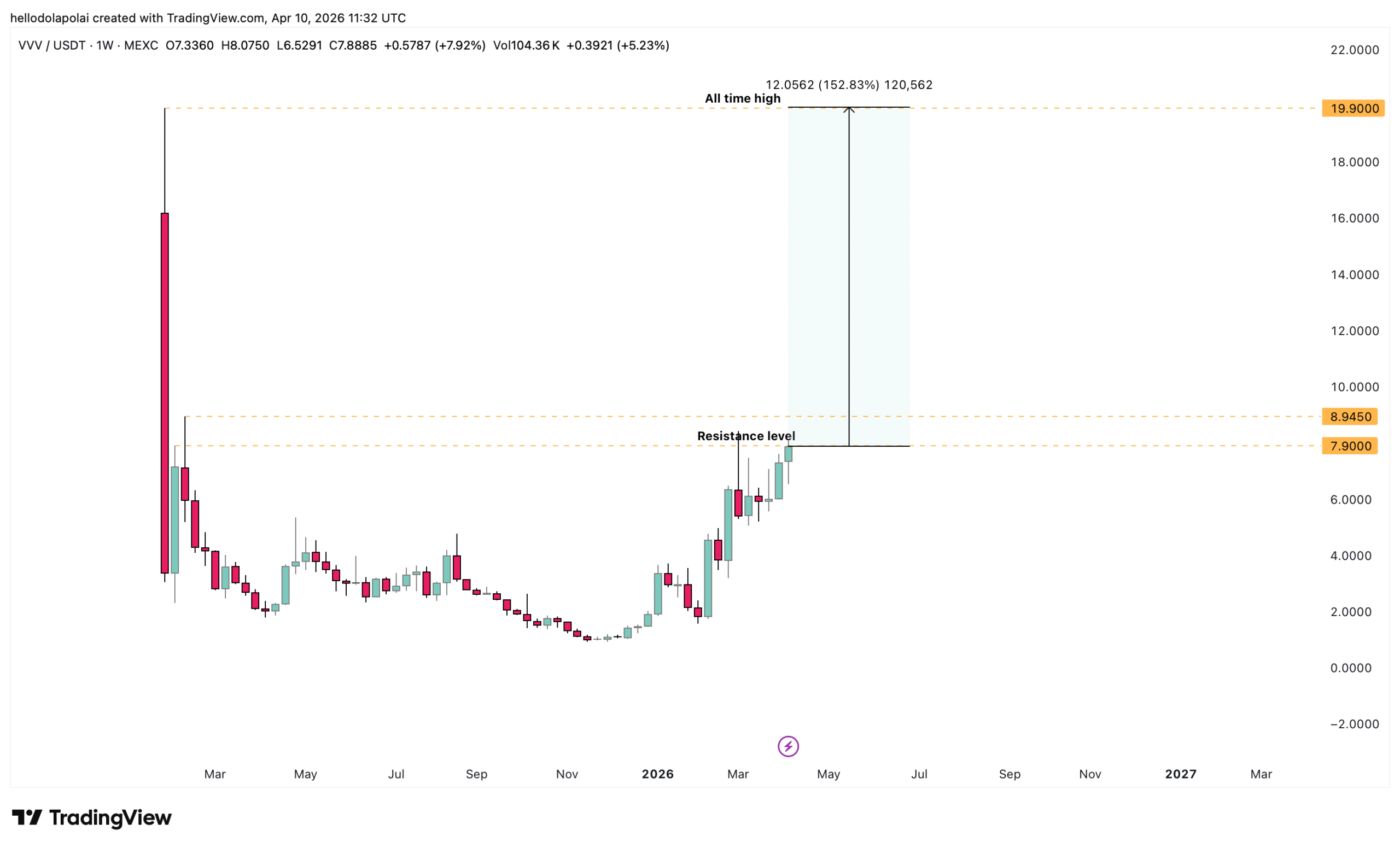 价格走势显示当前水平与更广泛的突破区域之间阻力很小,这表明如果动能保持,VVV可能进入价格发现阶段。