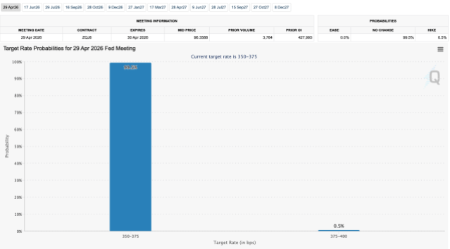 根据CME集团网站的信息,下一次FOMC会议定于一周后的2026年4月29日举行。与往常一样,会议将持续两天,随后举行新闻发布会。这些会议已提前数月安排,因此对市场来说并不意外。