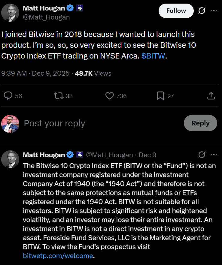 “我们遇到的大多数投资者都相信加密资产会持续存在,但他们不知道赢家会是谁,也不知道会有多少成功者,”Bitwise首席投资官Matt Hougan表示。“指数方法是一种让人们投资于该主题而无需预测未来的方式。”