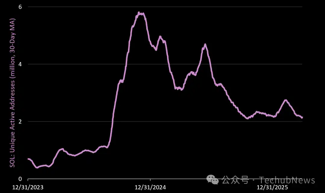 唯一活跃地址 = 每天至少发起一笔交易的独立钱包地址。Solana 网络在第一季度平均每日活跃地址为 240 万个,环比增长 7.5%,但同比下降 4.8%。