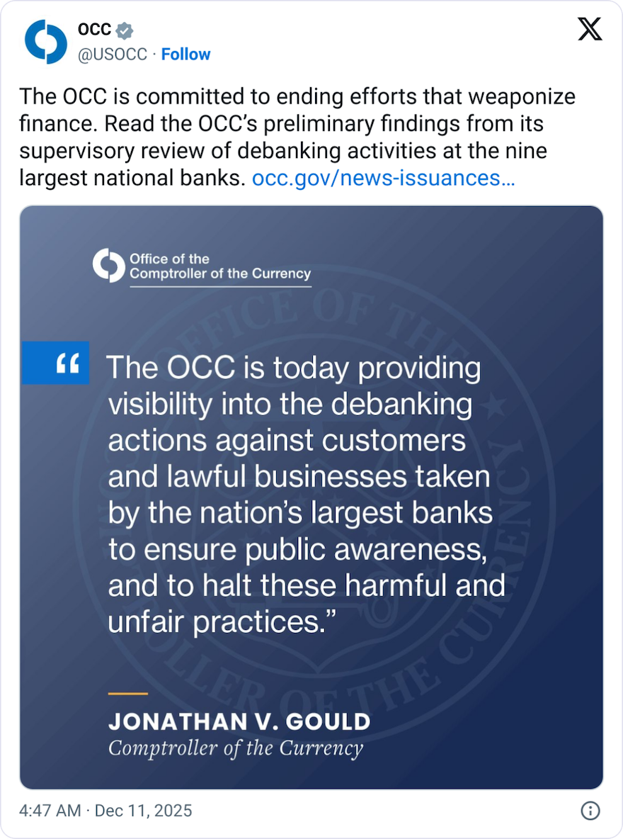 OCC启动审查是因为前总统特朗普于8月签署行政令,要求调查银行是否基于政治或宗教信仰对个人实施去银行化或歧视。