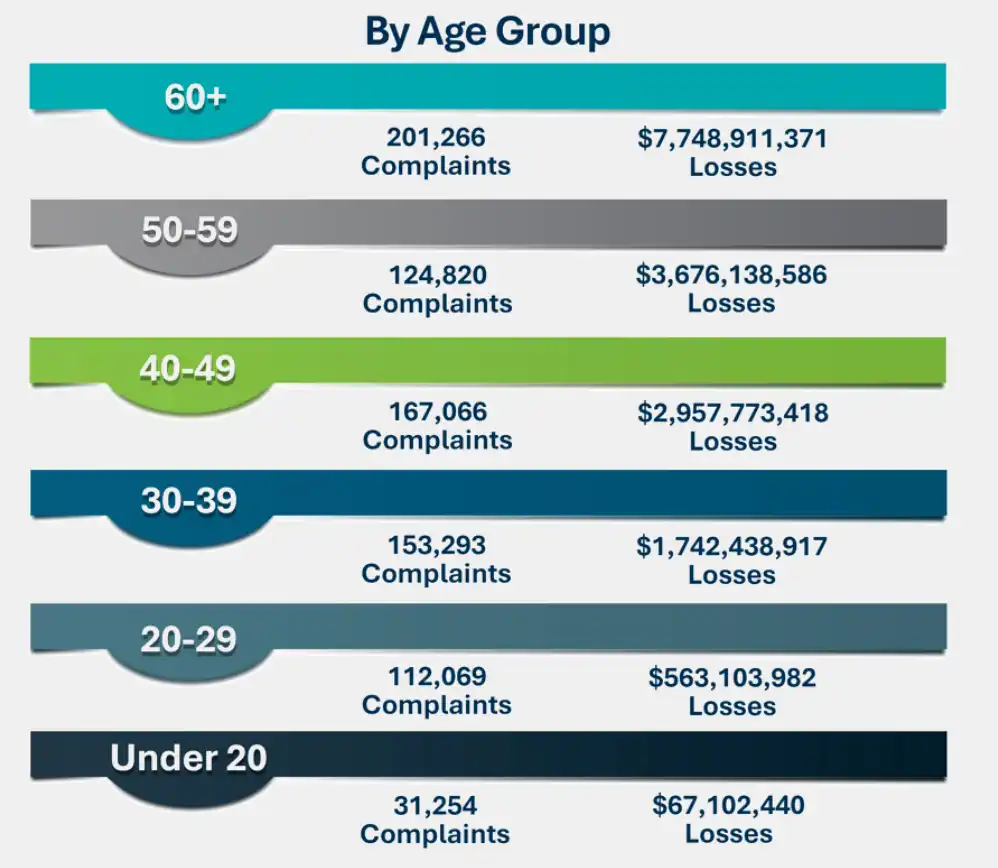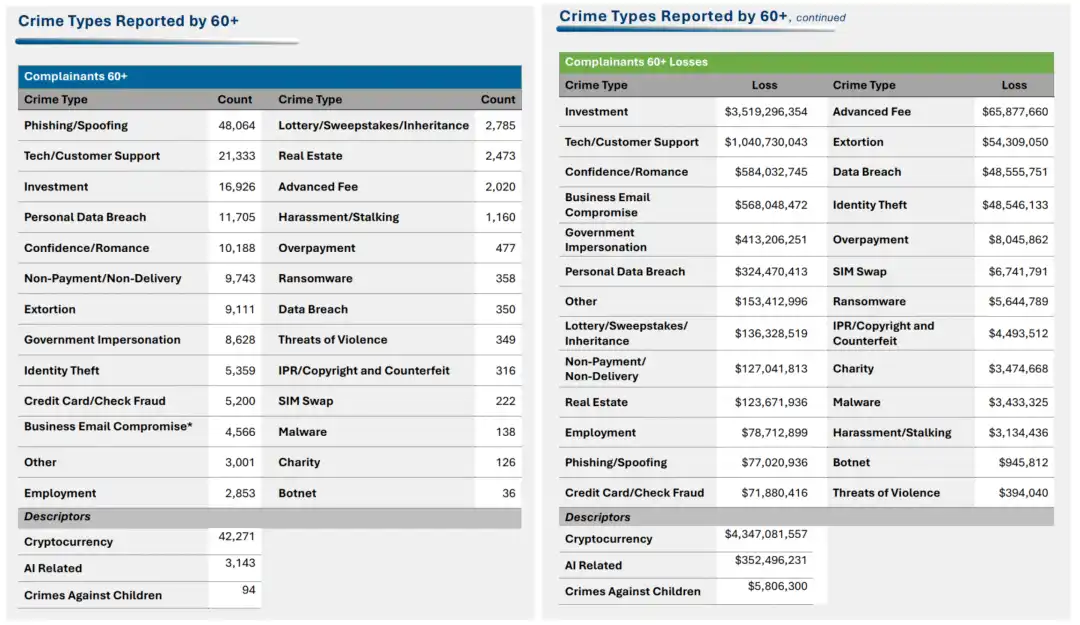 加密货币相关投诉共计 181,565 起,累计造成损失 113.66 亿美元,较 2024 年增长 22%。其中,18,589 名投资者的损失超过 10 万美元。在所有投诉者中,60 岁以上群体占比最高。