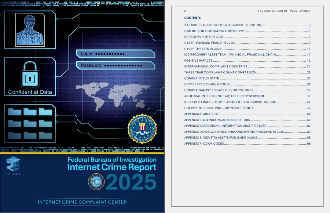 2026 年 4 月 7 日,美国联邦调查局(FBI) 发布了《2025 年互联网犯罪报告》。该报告正值 FBI 网络犯罪举报中心(IC3) 成立 25 周年之际,基于 2025 年收集的超 100 万件投诉数据,深入分析了突破 208 亿美元的历史性损失规模、受害者画像、投资诈骗等核心犯罪类型,并重点关注了人工智能(AI) 在网络诈骗中的演变趋势及执法部门在资产追回方面的突破。