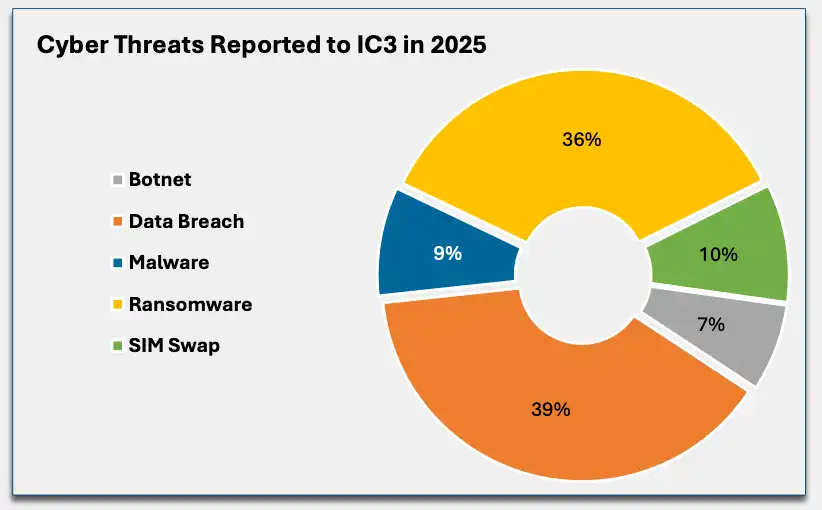 2025 年向 IC3 申报的网络威胁类型包括: