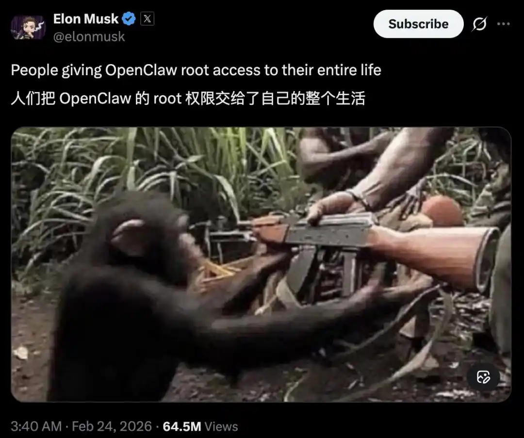 马斯克转发了这条帖子,配了一张电影《猩球崛起》中士兵把AK-47递给猩猩的截图,写道: