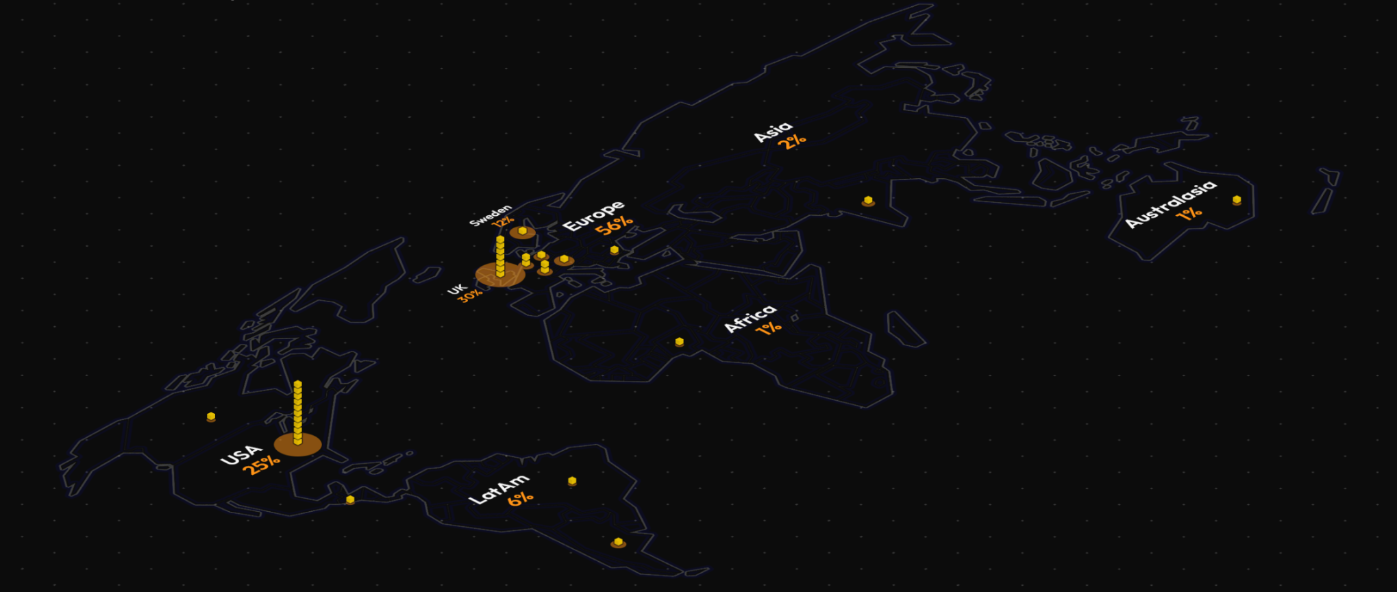 统计图片显示,光美国和欧洲两地就拥有 26 名开发者,拉丁美洲 3 名,分别位于阿根廷、巴西和萨尔瓦多。剩余四位分布在非洲、亚洲(印度)、澳大利亚和加拿大。