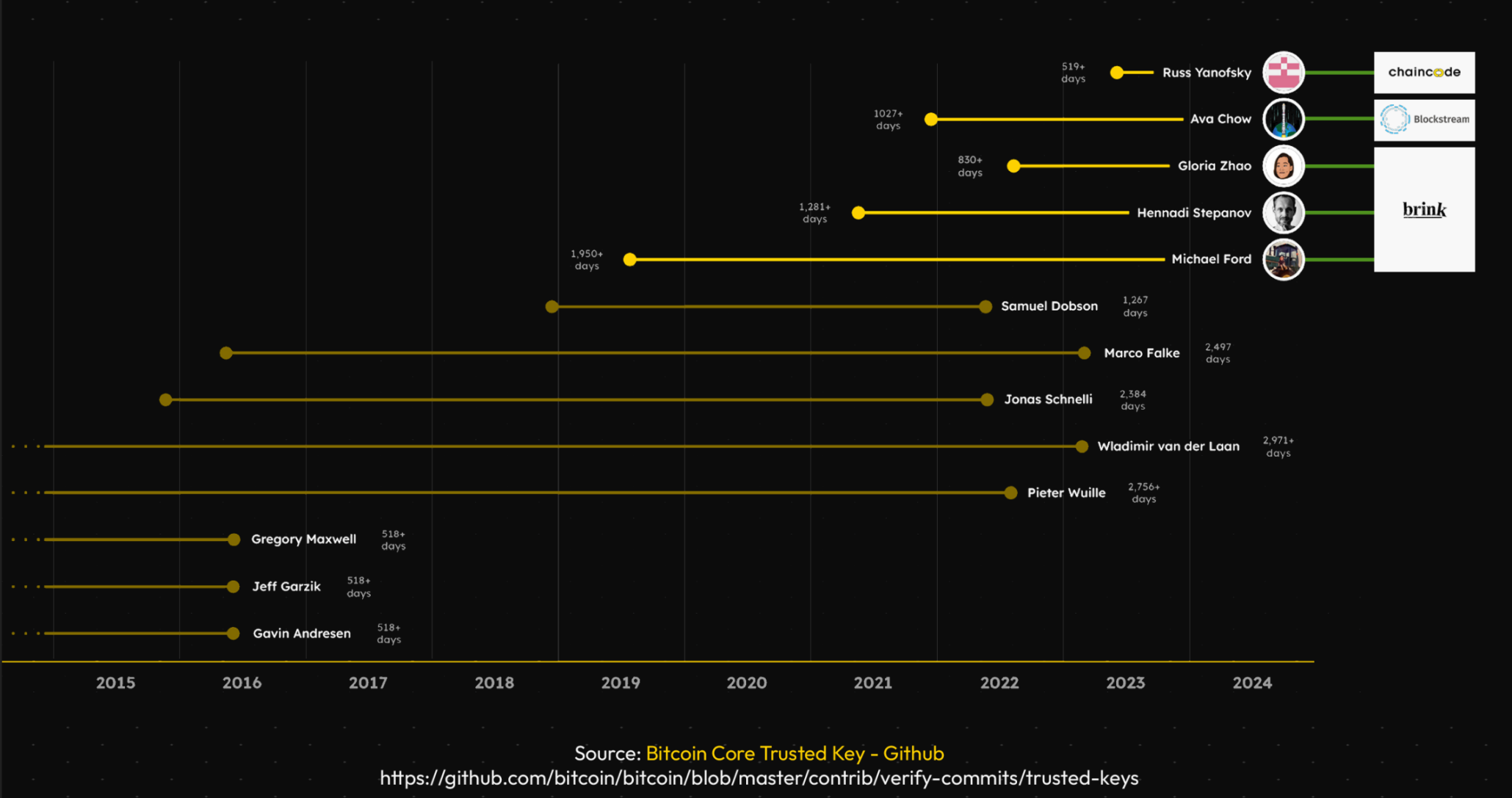 报告为我们揭秘了这个在 10 年中只有 13 人的 Bitcoin Core 维护者,即有权限将代码合并到 Bitcoin Core 的人。