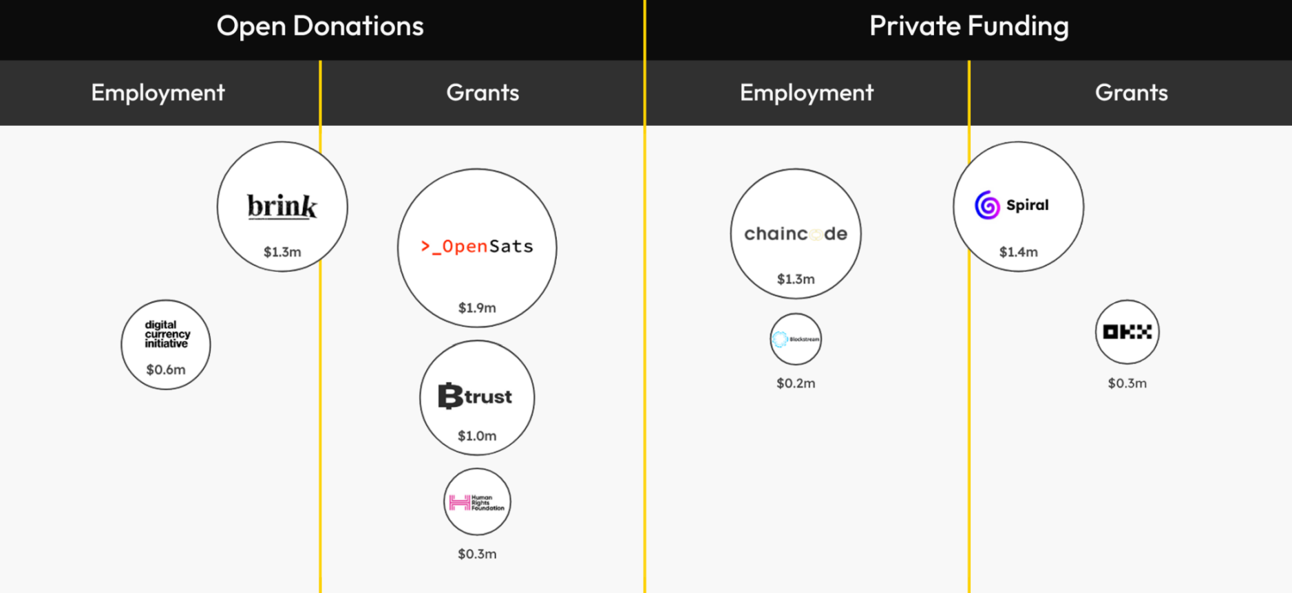 至于这些组织资助的覆盖范围,在之前的介绍中已经或多或少有所涉及。Brink、OpenSats、Maelstrom、Spiral 和 OKX 的资助并不固定于某个地区,Blockstream、MIT DCI 以及 Chaincode 主要面向美国且以雇佣为主,其他则主要面向欧洲、非洲、拉美,且大部分采用资助模式。