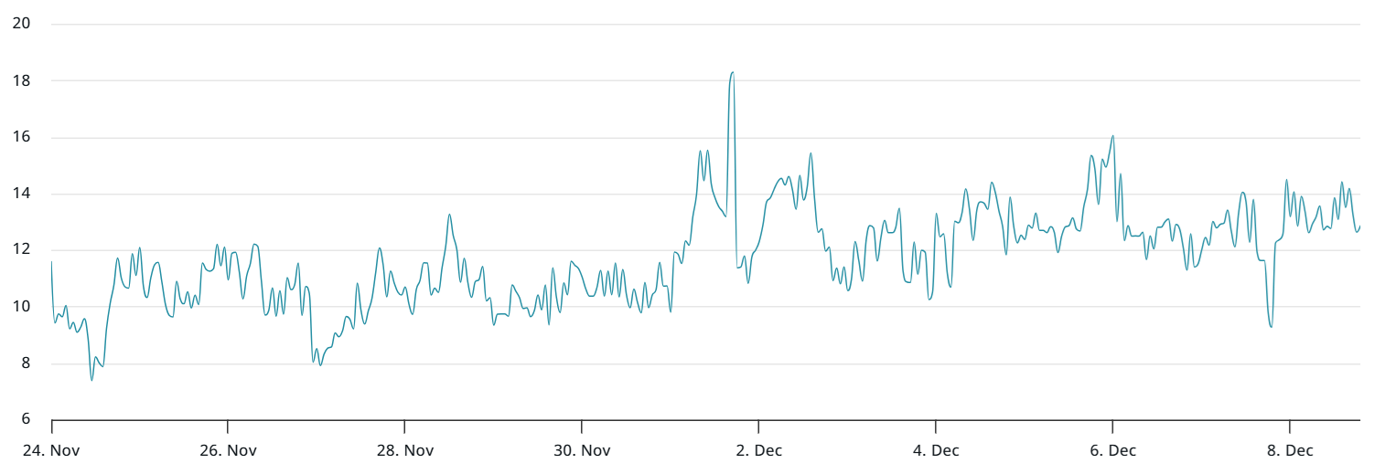 过去两周,比特币月度期货相对于现货价格的溢价(基差率)始终低于5%的中性阈值。看涨杠杆需求疲弱反映出比特币自10月历史高点以来28%的跌幅。此外,对全球经济增长的担忧也影响了市场情绪。