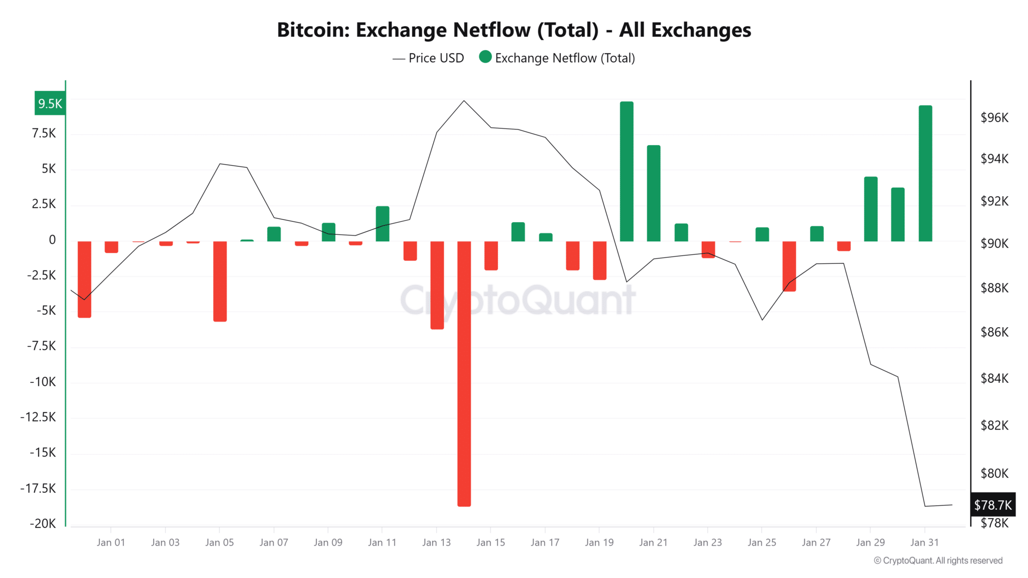 交易所抛压激增:CryptoQuant 数据显示,比特币已连续三天录得交易所净流入,截至发稿,净流入量达 9.5 千 BTC,较前一日的 3.7 千 BTC 大幅跃升,期间超 87 千 BTC 在交易所完成出售,激进现货抛售迹象极为明显。