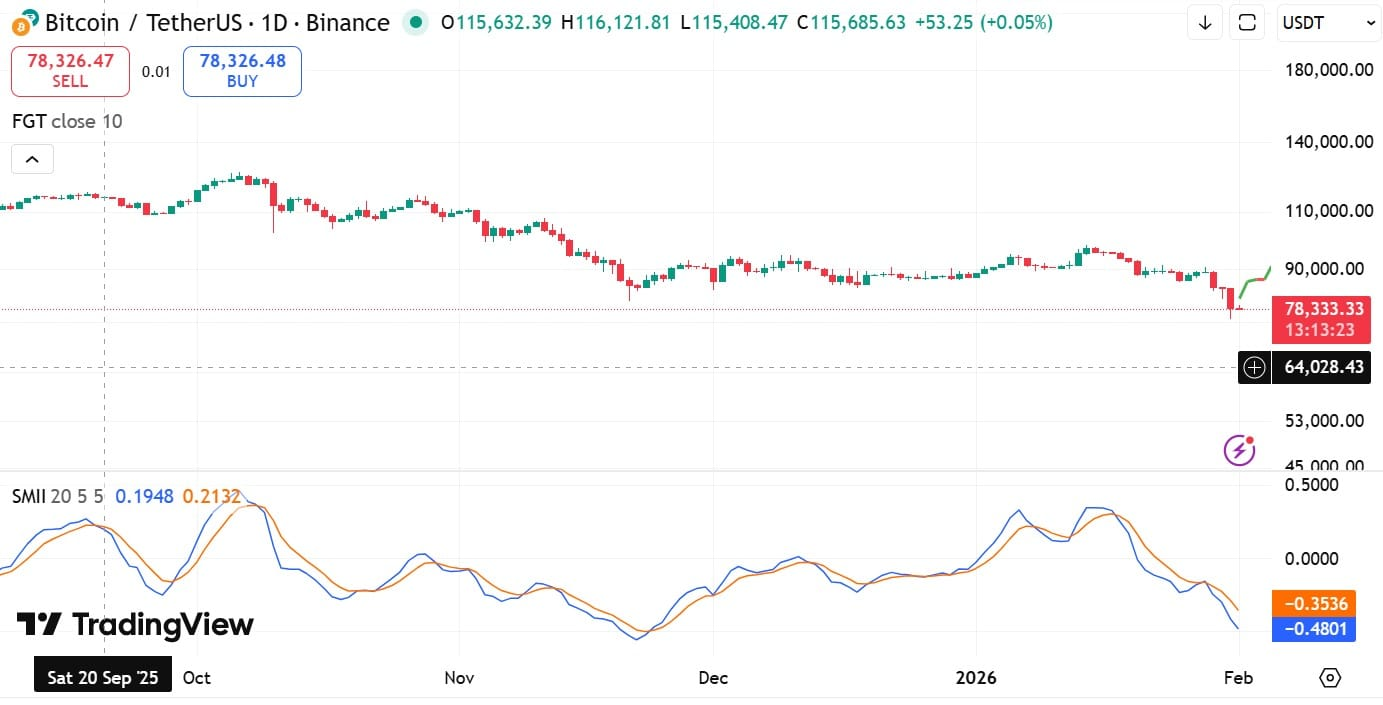 比特币跌破 8 万美元关键关口的过程中,清算潮同步爆发。据 CoinGlass 统计,市场累计清算 7.36 亿美元的比特币多头头寸,恐慌性出逃进一步放大了下行势头。技术指标层面,比特币随机遍历指标(Stochastic Ergodic Indicator)出现看跌交叉后,进一步跌至 - 0.46 的负值区域,这一状态表明市场下行动能强劲,买家已完全被挤出,卖家掌控绝对主导权。