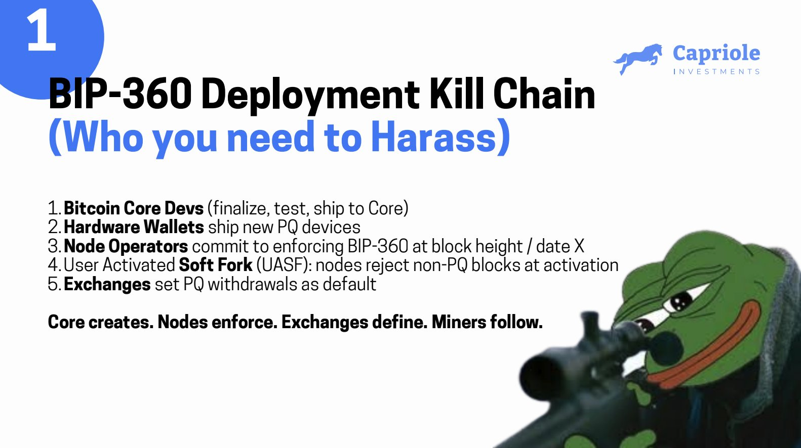 但Capriole在周四的X推文中补充说,新标准的实施需要硬件钱包提供商、节点运营商和加密货币交易所之间达成更广泛的共识。爱德华兹称:"未来几年将有20-30%的比特币被量子黑客窃取。我认为到2028年仍未迁移至BIP-360的所有币都应该被销毁。"