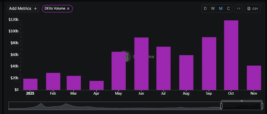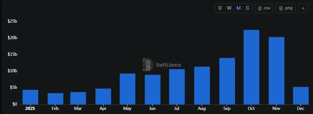 此外,截至 12 月 8 日,累计 DEX 交易量突破 2 万亿美元,2025 年迄今交易量约达 6800 亿美元,月度峰值于 10 月达到 1192 亿美元。