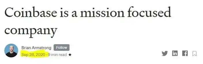 2020 年 9 月 27 日,Armstrong 在博客上发布了那篇著名的文章《Coinbase 是一家使命导向的公司》(Coinbase is a Mission Focused Company)。他在文中划定了明确的界限: