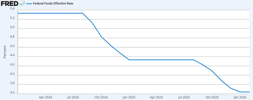 自2024年1月起,美联储联邦基金有效利率始终保持在3.6%以上的水平。尽管市场预期未来会有温和的降息路径,但目前的实际利率依然维持在相对高位。