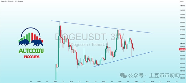 狗狗币自2021年高点以来,长期处于一个扩大三角整理区间内,目前价格再次接近下方趋势支撑。周线级别上,一个多年的“杯柄形态”已基本构筑完成,近期回调并未破坏该形态结构。伴随着成交量收缩和动能指标修复,高时间框架的RSI已回落至中性水平50附近,与2021年大涨前的状态相似;同时周线与月线MACD也接近转强,暗示可能出现趋势转换。