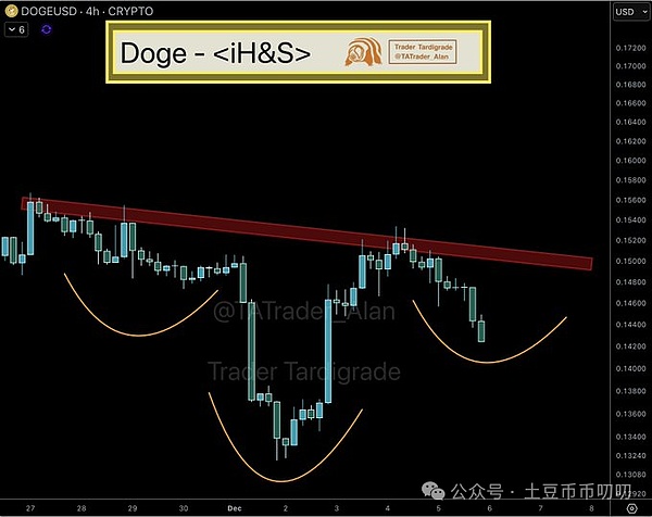 短期来看,4小时图表显示狗狗币可能正在构筑“反向头肩形态”,这常被视为趋势反转信号,表明下跌动能减弱,有望迎来反弹行情。交易员指出,若能站稳关键阻力之上,价格或开启加速上行阶段。