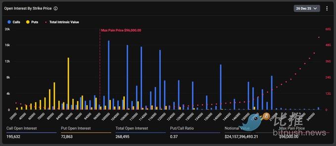 衍生品市场的结构也在一定程度上解释了比特币为何在圣诞周显得格外克制。本周五,比特币市场将迎来历史上规模最大的期权结算,总价值高达 240 亿美元。目前多空双方正在关键价位展开激烈博弈: