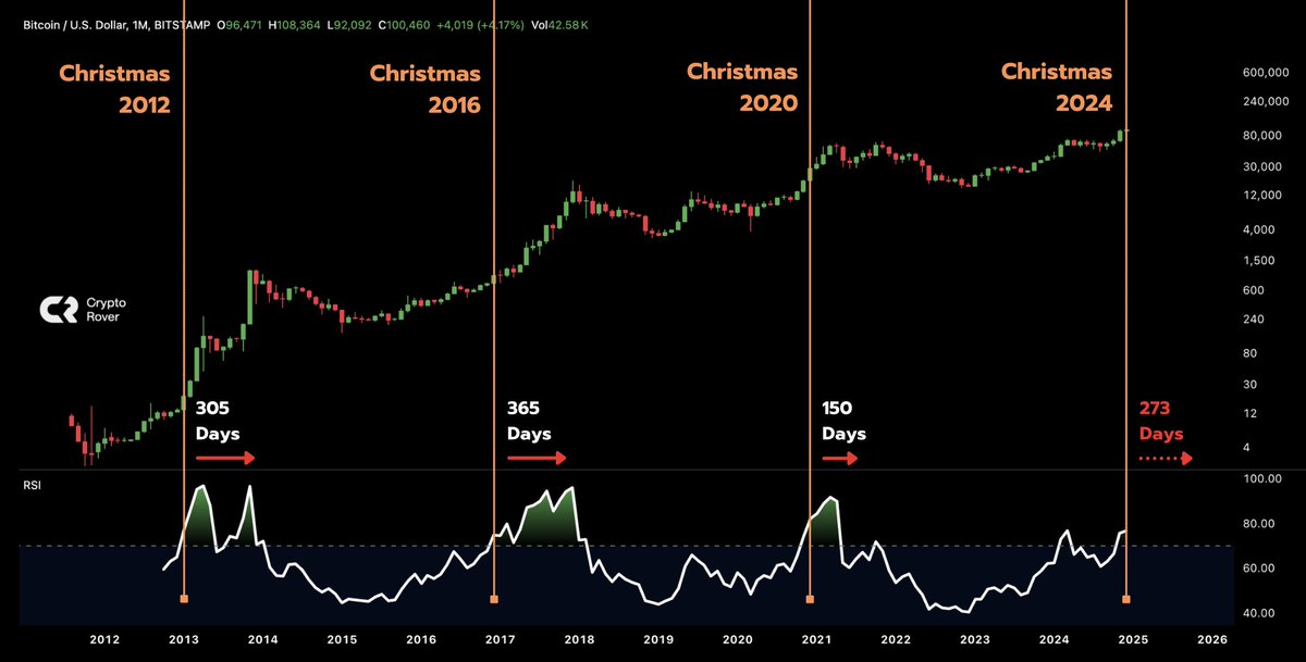 比特币的“圣诞行情”历来难以捉摸。回顾历史,既有像2012年和2016年那样,节日期间大涨33%和46%的耀眼表现,也不乏平淡乃至下跌的年份。统计来看,自2011年以来,比特币在圣诞期间的平均涨幅约为7.9%。