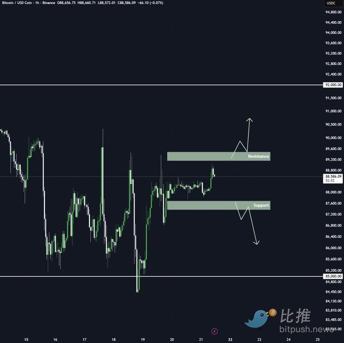加密货币分析师 DrBullZeus 表示,BTC持续在相同的支撑位和阻力位之间波动,尚未出现明显的突破。在出现明显的突破之前,价格仍将维持在区间震荡走势。突破阻力位将打开通往 92,000 美元关口的空间,而跌破支撑位则可能导致价格回落至 85,000 美元区域。