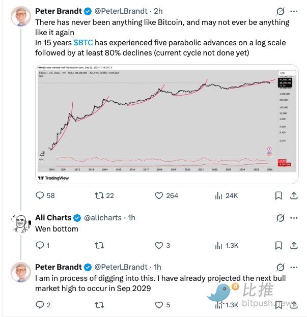 传奇交易员 Peter Brandt 最新复盘指出,比特币在 15 年内经历了 5 次“抛物线增长后回撤 80%”的循环,而本轮周期的调整尚未见底。尽管短期规律冷酷,但他通过周期推演,预判下一个牛市巅峰将在 2029 年 9 月 到来。Brandt 强调,这种前无古人的资产属性注定其要在极端的洗盘中迈向新高。