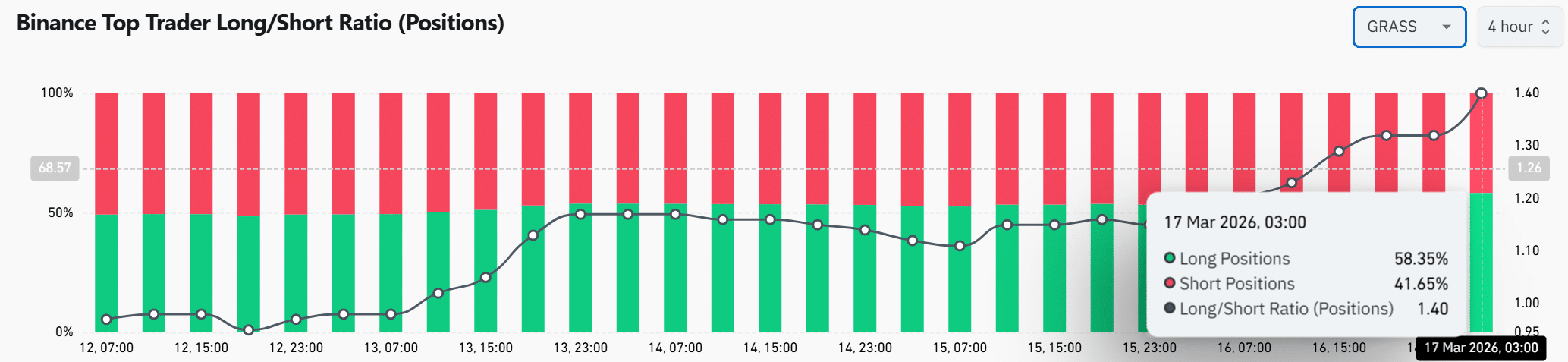 - 持续的买家控制和不断增加的杠杆 positioning 表明,如果前方阻力减弱,GRASS可能会继续攀升。