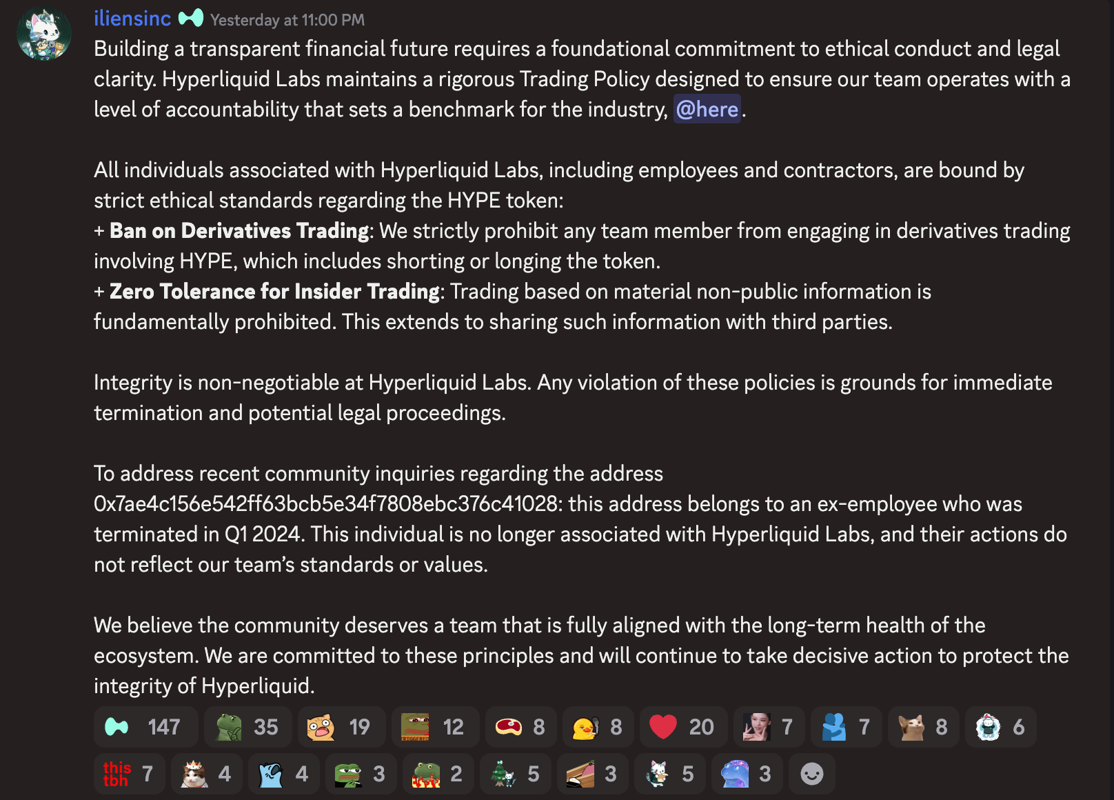 Iliensinc在Discord帖子中表示,Hyperliquid Labs制定了严格的交易政策,确保团队以"树立行业标杆的问责标准"运作。
