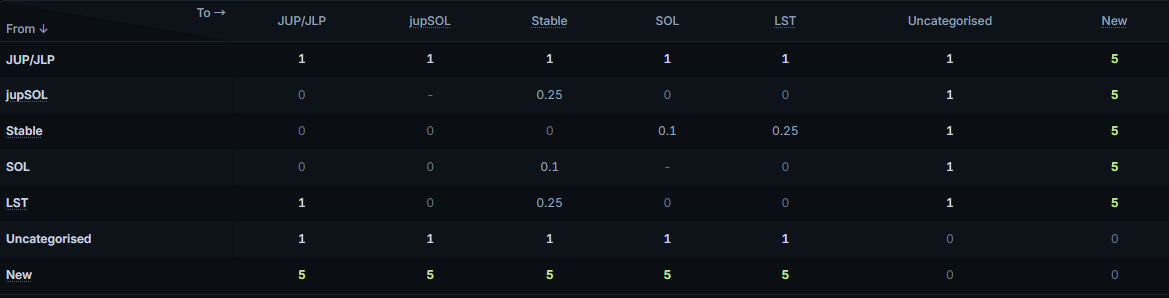 符合条件的交易币种:如下表,包括 JUP、JUP/SOL、JUP/jupSOL、JUP/Stable、JUP/LST、JUP/Uncategorised、JUP/New(指的是刚上线 Jupiter 24小时内的新币),表中的数字表示,每完成 1 万美元的交易量可获得的卡牌数量,例如,完成价值 1 万美元的 JUP 兑换 SOL 的交易量,即可获得 1 张卡牌。