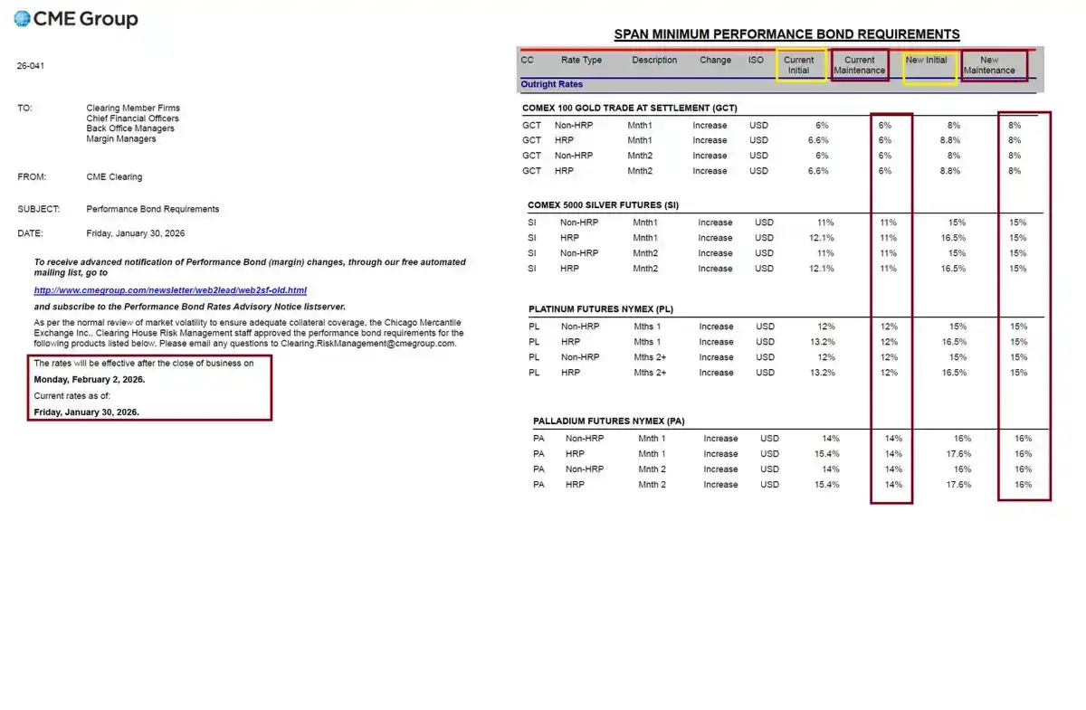 随着价格下跌,芝加哥商品交易所(CME)迅速提高了黄金和白银期货的保证金要求。例如,非高风险账户的白银期货保证金比例从 11% 上调至 15%。这迫使许多资金不足的多头交易员被强制平仓,卖盘涌出进一步压垮了价格,形成了恶性循环。据统计,仅代币化期货一项,24 小时内的爆仓金额就高达 1.4 亿美元。