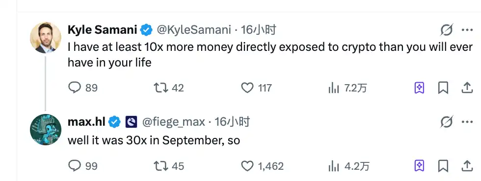 Kyle 看到后没忍住,直接回复了一句极具币圈特色的“财富压人”:我直接投在 crypto 上的钱,至少是你这辈子总和的 10 倍。