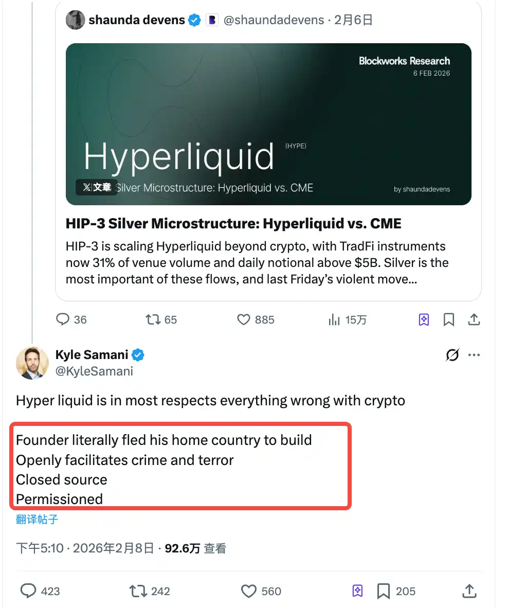 另一方面,你看 Arthur Hayes 没有反驳 Kyle 的任何一条指控,没有替 Hyperliquid 的闭源辩护,也没有解释 Jeff Yan 为什么搬去新加坡。