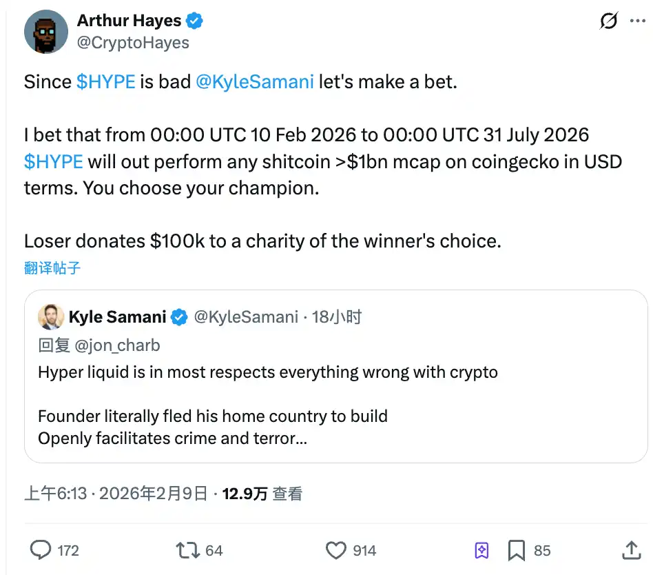 「既然你觉得 HYPE 这么烂,那咱们赌一把。从 2 月 10 号到 7 月 31 号,HYPE 跑赢你随便选的任何一个市值超 10 亿的币,输的人掏 10 万美元捐给对方选的慈善机构。币你挑,我只赌 HYPE 赢」。