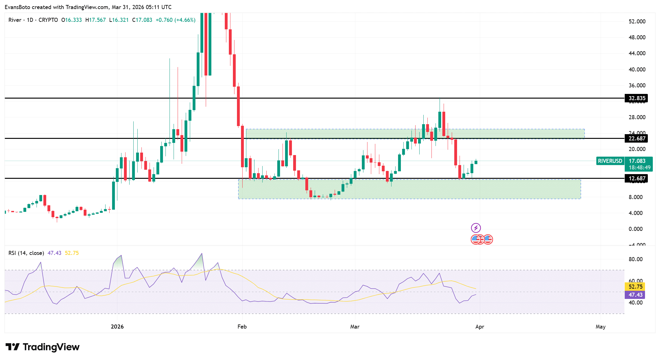 RIVER已从12.68美元的需求区反弹,目前正推向22.68美元的区间中部阻力位。这一复苏反映了在先前下跌后新的买盘兴趣。然而,结构仍然处于区间震荡,32.83美元是上方的下一个主要阻力位。