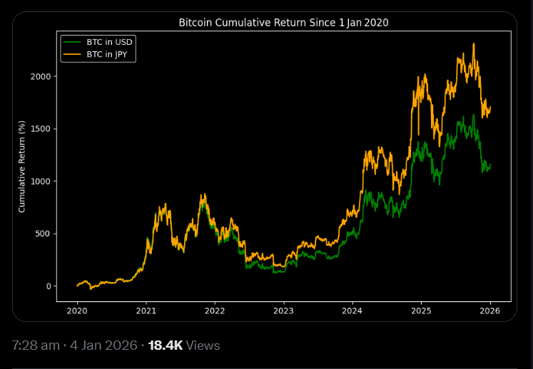 数据显示,自2020年以来比特币对美元升值约1,159%。相较日元而言升值幅度更高,达到1,704%,这表明以日本货币计价的资产价值增值与比特币相比存在日益扩大的差距。