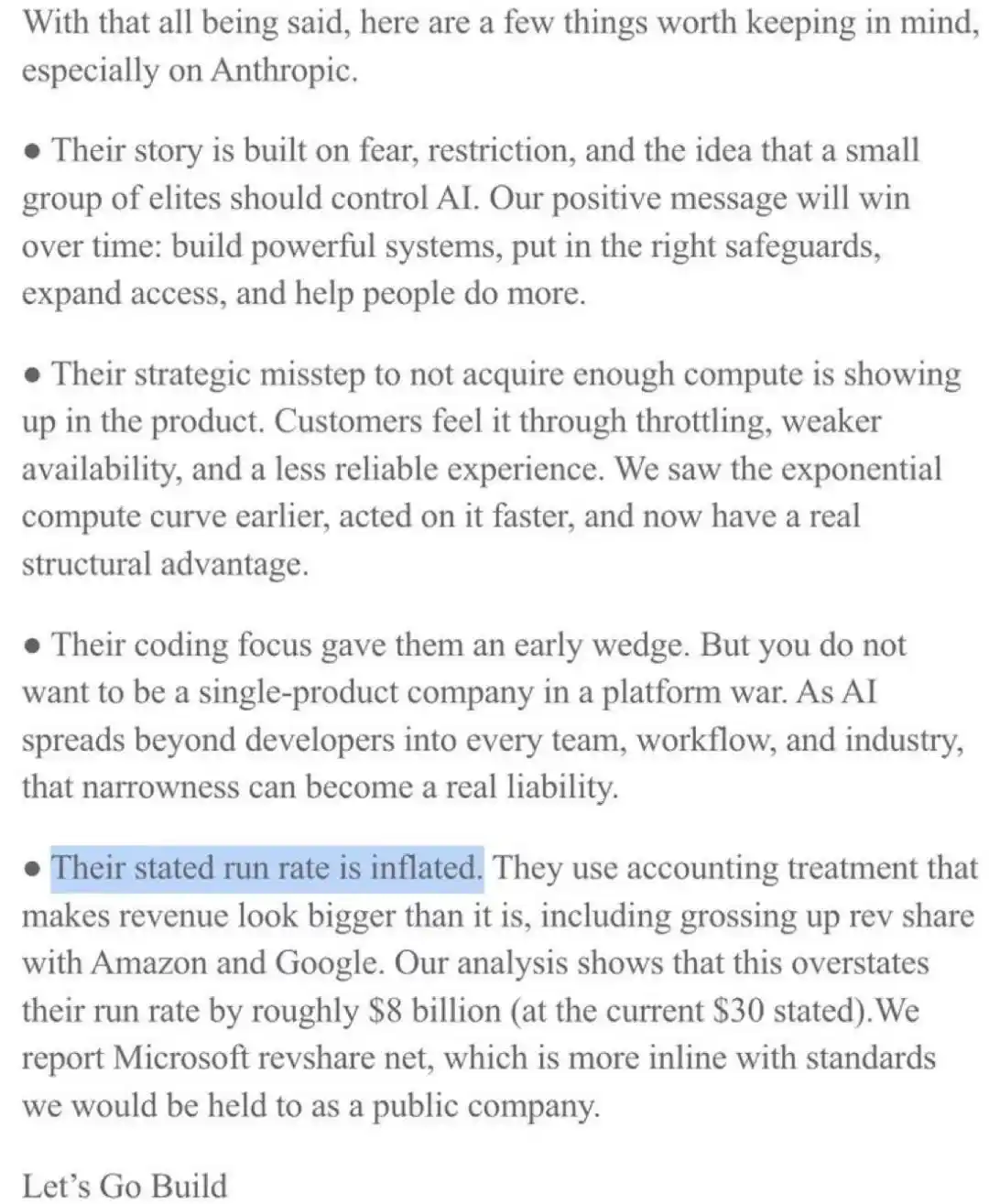 However, the memo states that $8 billion of Anthropic's annualized revenue was "inflated" through accounting practices, meaning their actual annualized revenue should be $22 billion, not exceeding OpenAI's $25 billion.