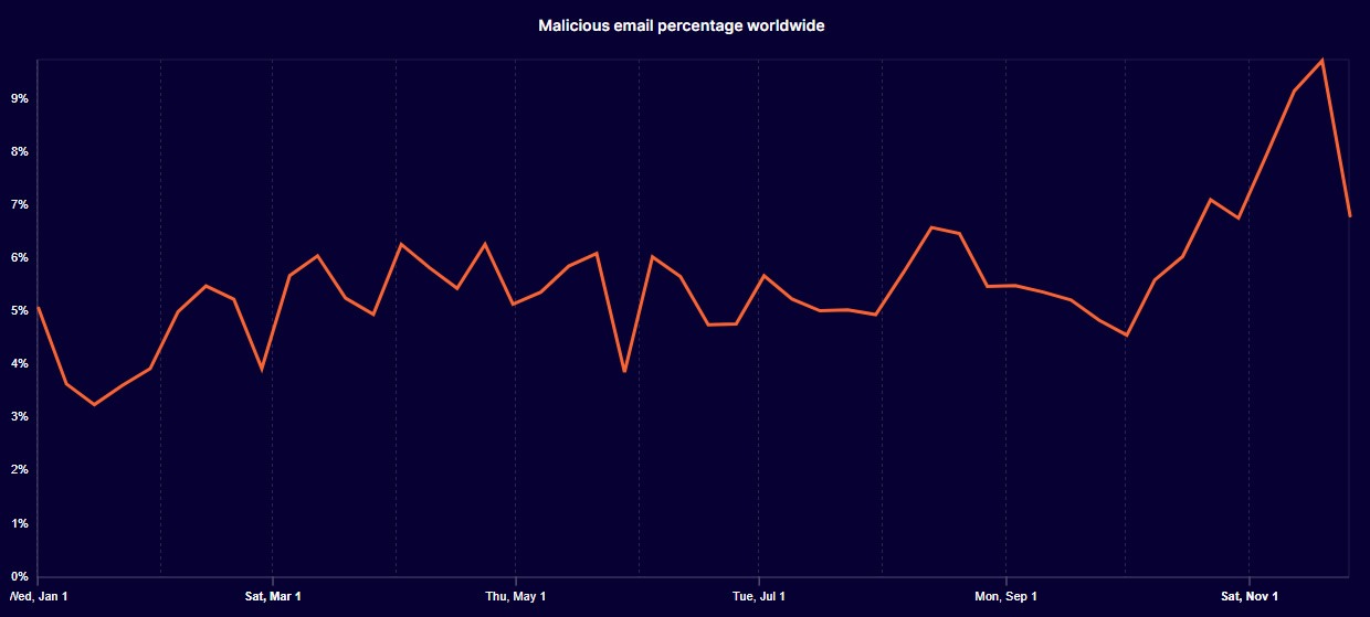 互联网基础设施巨头Cloudflare数据显示,全球发送的所有电子邮件中超过5%包含恶意内容。