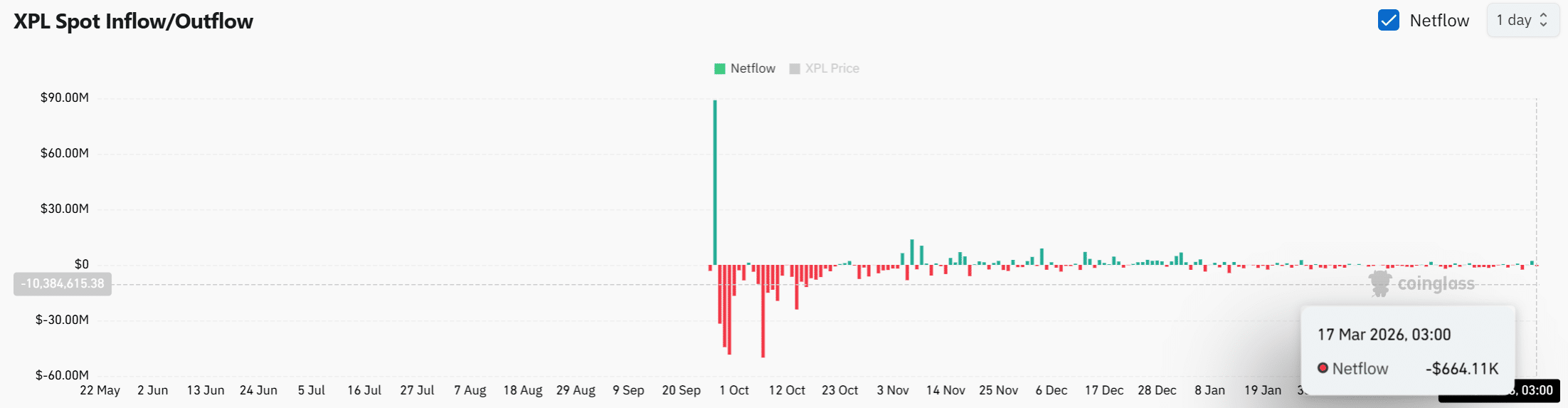 A交易所的净流出为负值,约有66.4万美元的XPL从交易所流出,这表明代币正在被转移出交易平台,减少了即时卖压,可能支持价格进一步上涨。
