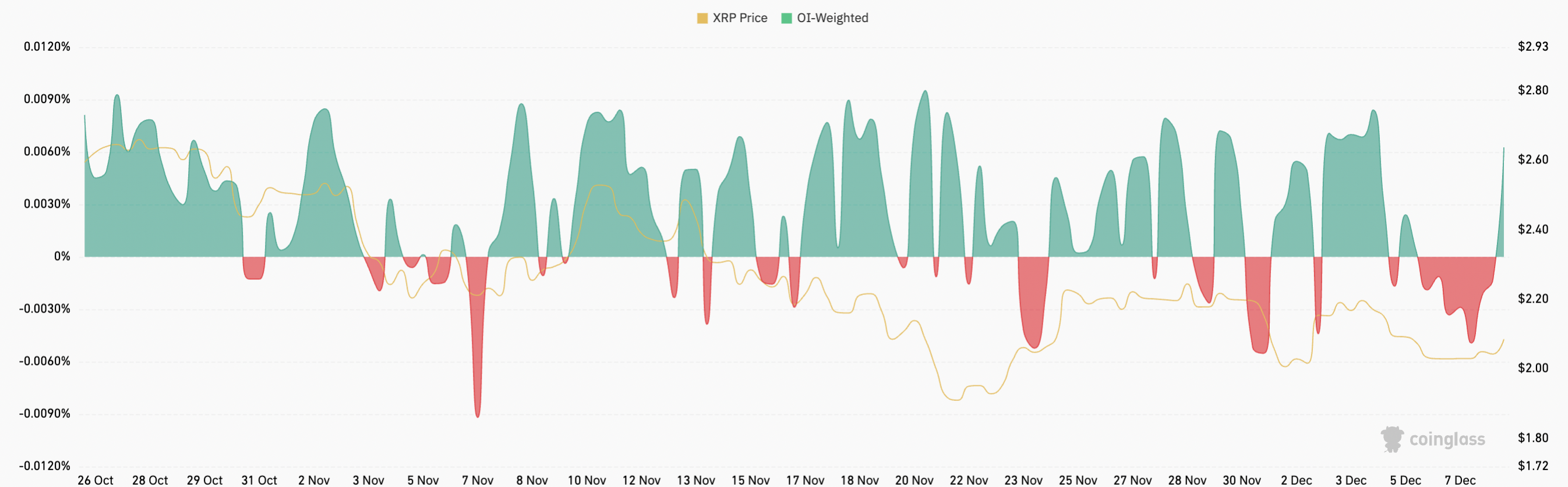 XRP的日资金费率已从前一天的0.0157%转为正值0.0189%,表明大多数交易者正在建立多头仓位。