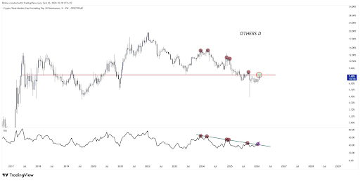 OTHERS D指数反映了主导地位的悄然变化。2026年初该指标低于5%,此后持续攀升,近期突破7%。最新双周K线显示主导率已达7.6%,正触及此前压制突破尝试的下行阻力趋势线。