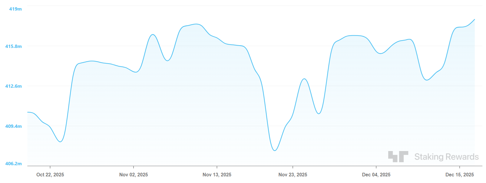Solana上的原生质押也有助于限制立即可供出售的SOL数量。目前,近68%的流通供应量被委托给网络的权益证明系统,这一比例在过去几个月中稳步增长。Solana上的质押收益率可以超过6%,因为SOL仍然保持通胀以抵消运营验证节点的成本。