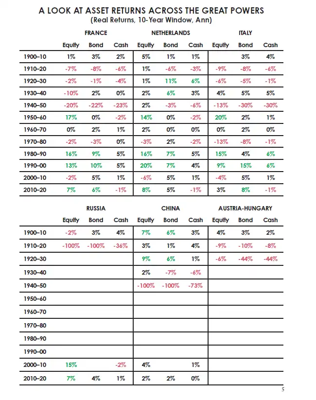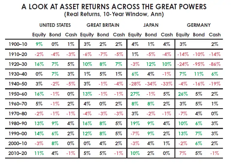 这 10 个国家中有 7 个至少经历过一次财富几乎被完全摧毁的情况,即使那些未见财富被摧毁的国家也经历了几十年的可怕资产回报,几乎使其在财务上走向毁灭。两个伟大的发达国家——德国和日本,有时候人们很容易会押注它们成为赢家——在两次世界大战中几乎所有财富都被摧毁,许多生命逝去。我看到许多其他国家有类似的结果。美国和英国(以及少数其他国家)是特别成功的案例,但即使是它们也经历了财富大规模摧毁的时期。