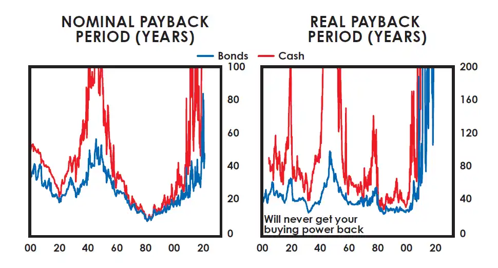 与其获得低于通货膨胀的回报,为何不买些东西——任何东西——其价值等于或超过通货膨胀?我看到许多投资我预期将显著跑赢通货膨胀。下面的图表显示了在美国持有现金和债券的回收期,以名义值和实际值表示。如图所示,这是有史以来最长的,显然是一段荒唐的时间。