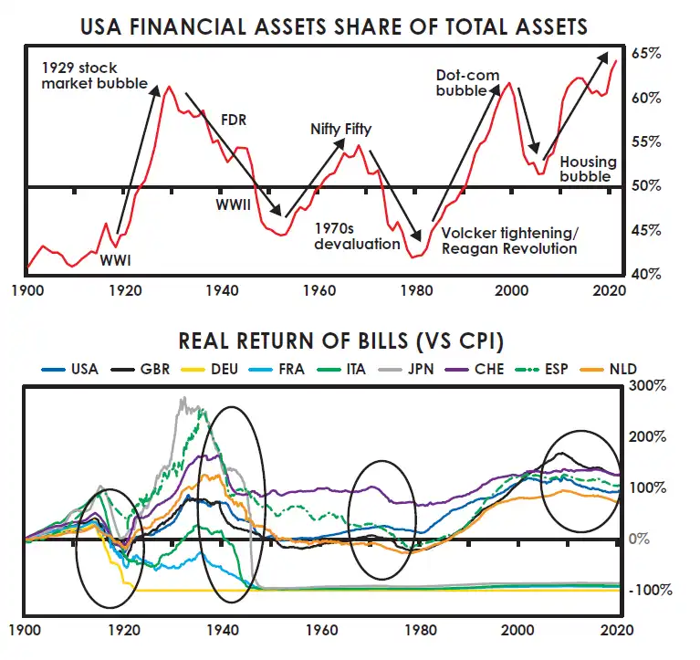 这导致"挤兑银行"式的债务问题出现,进而导致印钞以试图缓解债务违约和股市下跌的问题,进而导致货币贬值,金融财富相对于实际财富下降,直到金融资产的实际(通胀调整后)价值相对于有形财富重新变得低廉。然后周期重新开始。