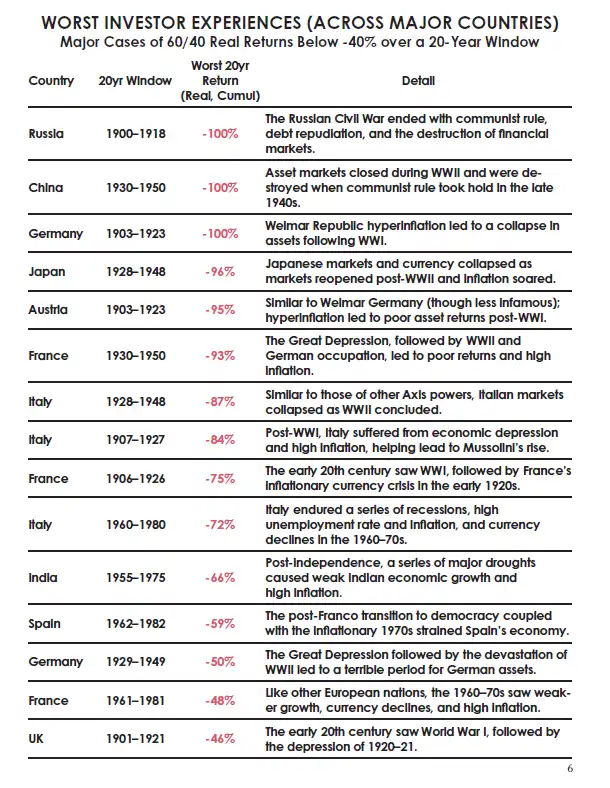 [6] 比利时、希腊、新西兰、挪威、瑞典、瑞士等较小国家以及新兴市场的差劣资产回报案例不在此表中。注意,为简洁起见,显示的是每个国家/时期的最差 20 年窗口(即包括 1903-23 年的德国会排除 1915-35 年的德国)。对于我们的 60/40 投资组合,我们假设在 20 年窗口内每月再平衡。