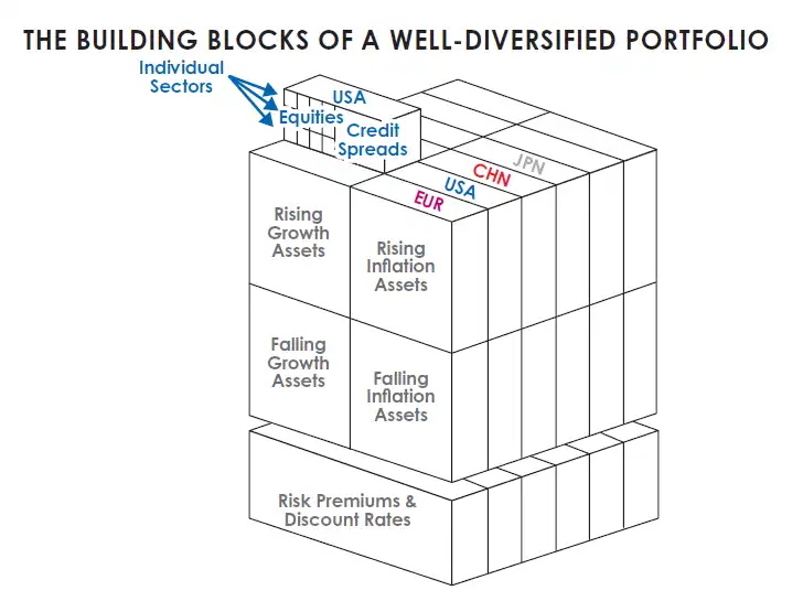 我的目标是将这些模块组合成一个均衡分散、并根据正在发生或将要发生的影响这四个驱动因素的世界事件进行战术性倾斜的投资组合。这些模块可以按国家、按环境偏好,一直细分到行业和个别公司的层面。当这一概念被应用于均衡投资组合时,效果如下图所示。我就是通过这个视角来审视历史事件、市场历史和投资组合行为的。