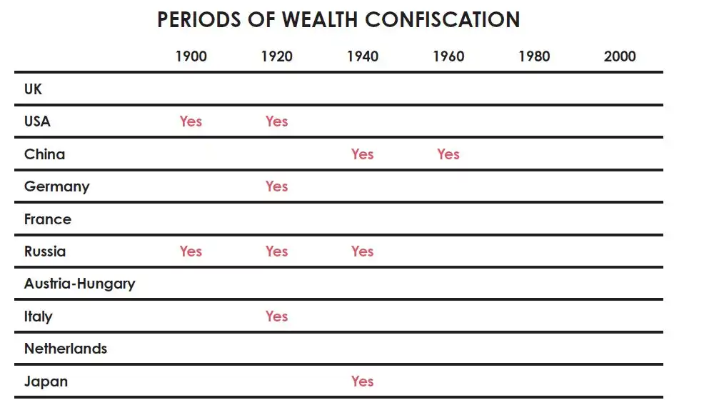 此外,财富没收、没收性税收、资本管制和市场关闭对财富的影响是巨大的。今天的大多数投资者对此类事情并不了解,认为它们不可能发生,因为他们回顾过去几十年不会看到这些情况。下表显示了这些事件发生在哪些十年。自然,最严重的财富没收案例发生在贫富差距大、经济条件恶化时内部出现财富争夺冲突的时期,以及/或者有战争的时期。